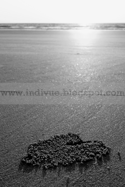 Goan beaches can offer very imaginative visions for a photographer. One of the best experiences I’ve had is this image I took recently: There are baby crabs in their eggs and in a heart shaped form around the big crab’s hole in the sand. –Love. Naturally?Bollywood? Almost.