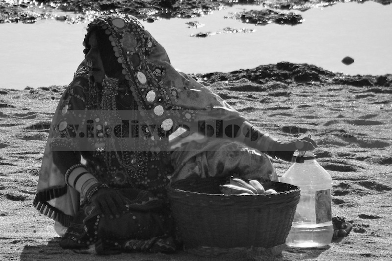 - Image 1: This photograph features a woman sitting on the beach, dressed in a traditional saree with intricate embroidery. The saree, a long piece of cloth draped elegantly around the body, is often worn with a blouse and petticoat. The woman also wears traditional jewelry, adding to her vibrant look. Her basket and bottle suggest she might be a vendor or someone involved in daily chores, portraying the practicality and versatility of the saree.