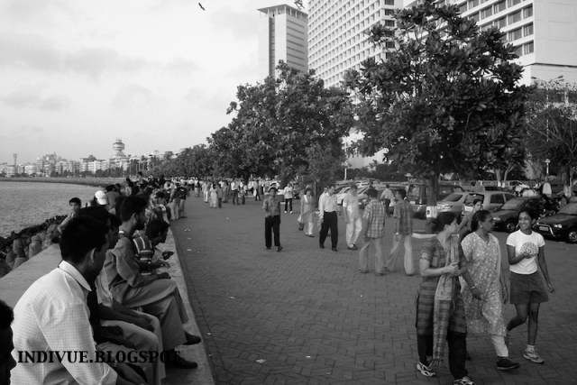 - Image 6: A bustling urban promenade with people strolling by the waterfront. Despite the modern urban setting, many women are seen in traditional sarees and salwar kameez, highlighting the enduring popularity of these garments even in contemporary settings.