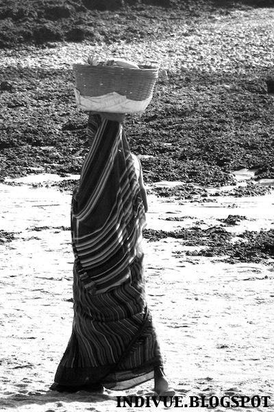 - Image 3: This image captures a woman walking along the beach with a basket on her head, showcasing the traditional saree’s functionality. The saree’s design is simpler compared to the heavily embroidered ones, highlighting its use in daily activities and labor-intensive tasks.