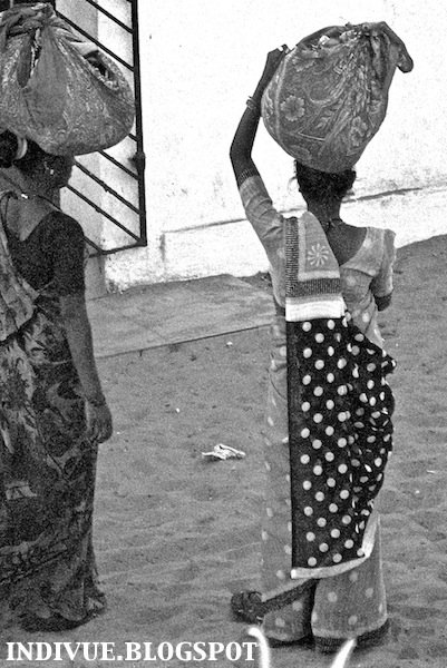 This photograph captures two women carrying heavy loads on their heads, a common sight in many parts of India. The women are dressed in sarees, which are beautifully adorned with polka dots and traditional motifs. The manner in which the sarees are draped allows for both mobility and balance, essential for carrying such burdens.
