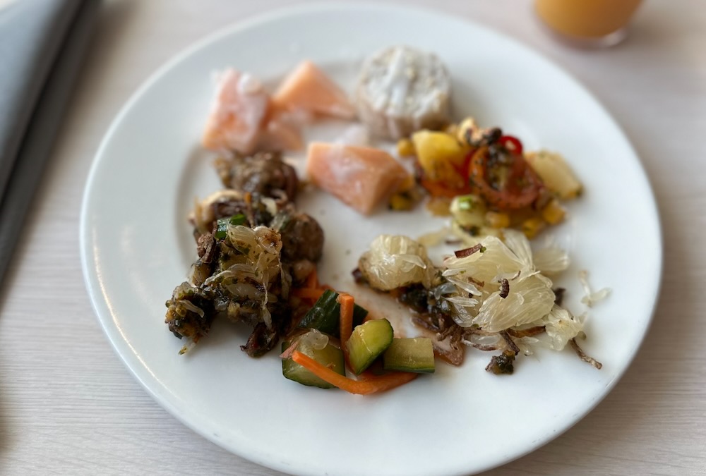 The Grande buffet’s Thai selection was a vibrant fusion of traditional and innovative dishes, featuring spicy pork salad, glass noodle salad with shrimp and pork, and spicy chicken salad, among many others. Noteworthy vegetarian options included, for example, the pomelo salad and the mushroom salad, which offered a refreshing divergence from the meat-heavy theme, although it was observed that many salads actually contained fish, a detail that vegetarians should be mindful of. The reason for that must have been the famous Nam Pla fish sauce famous in Thai cooking. But there’s always some more vegetarian food in the normal Grande buffet, ensuring a satisfying dining experience for vegetarians.