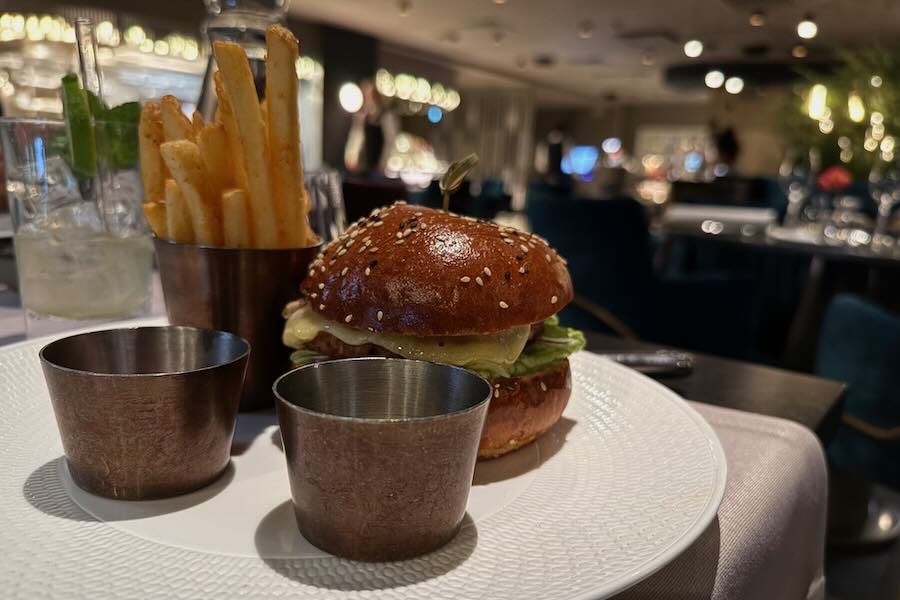 For the main course, I wanted to try the burger and was delighted that a vegetarian version was made possible. The restaurant’s famous fries with truffle mayonnaise lifted the vegetarian burger to an entirely new level. For dessert, I enjoyed a traditional crème brûlée with berries. The non-alcoholic lime soda I chose surprised me with its spiciness – with perhaps a hint of black pepper. The entire dinner was atmospheric, calm, and successful, full of small skillful details. It was a pleasure to observe the work of the waiters and chefs and their excellent service.